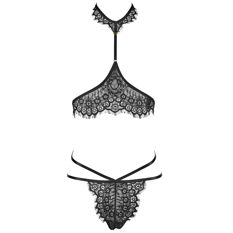 Black Halter Adjustable Eyelash Lace Low-Waist with Sheer Construction Elastic Strap Thong Lingerie Set